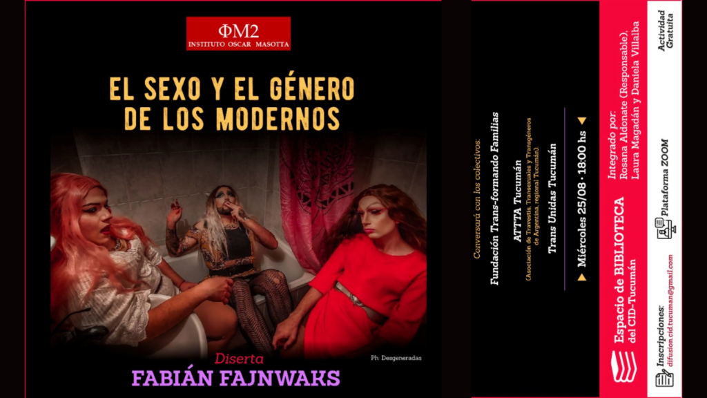“EL SEXO Y EL GÉNERO DE LOS MODERNOS“, organizada por el espacio de Biblioteca CID-Tucumán IOM2, será este miércoles 25 de agosto a las 18 hs. por plataforma Zoom y tiene por objetivo establecer una conversación entre referentes del psicoanálisis de orientación lacaniana con sectores ocupados en la cuestión de género de la provincia.