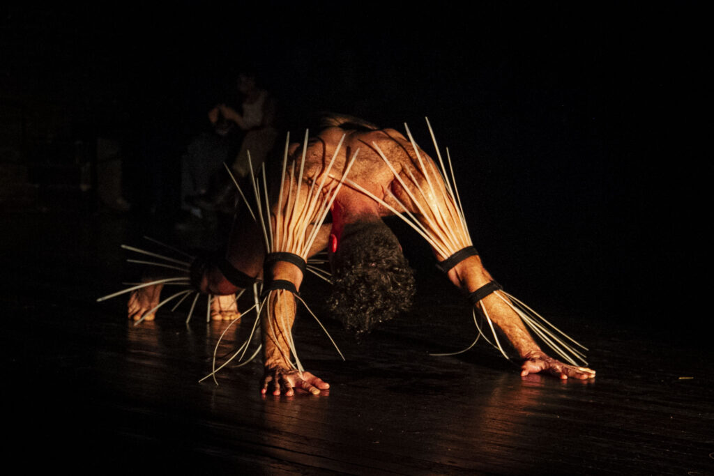 Se recupera y recorre el espacio. Pocas palabras, y comienza un gesto de saludo con personas imaginarias. Inmediatamente es una tendida en el suelo y un gemido, y se vuelve un ritual: saludo, suelo y gemido, dos saludos, suelo, gemido, tres saludos, suelo gemido, cuatro, suelo y gemido. No hay nombres, sólo música, más saludos, sudor pintando la madera y más gemidos.