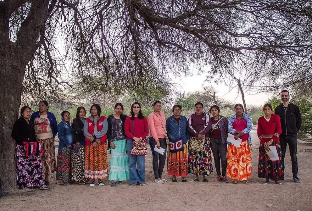 Desde el año 2015, Andrea trabajó con las comunidades desde diversas instituciones: el Ministerio de Ambiente de la Nación Argentina, la organización indígena ARETEDE, la ONG Prosoco, la Fundación Buena Vida, el IFA-Galerie y el Museo de Bellas Artes de Salta, entre otras. No obstante, su trabajo con comunidades indígenas comenzó de la mano de trabajadorxs del INTA con lxs que ya había trabajado en comunidades rurales y proyectos de comunicación comunitaria con radios rurales en los Valles Calchaquíes, experiencias que sirvieron como antecedentes para que la convoquen nuevamente, junto a otrxs compañerxs, a realizar un diagnóstico sobre la producción de textiles artesanales en comunidades wichís de una zona determinada del Chaco salteño. A este objetivo se sumó el de conocer qué pensaban las mujeres, quienes no estaban participando del proceso de consulta y gestión territorial, desarrollado por los varones de las comunidades a través de Lhaka Honhat. Al respecto, las mujeres manifestaron que querían trabajar a través de una venta justa de sus tejidos. Esta iniciativa condujo a Andrea a investigar, a interesarse por la economía social y a conocer aspectos técnicos y culturales de los textiles del Gran Chaco Americano.