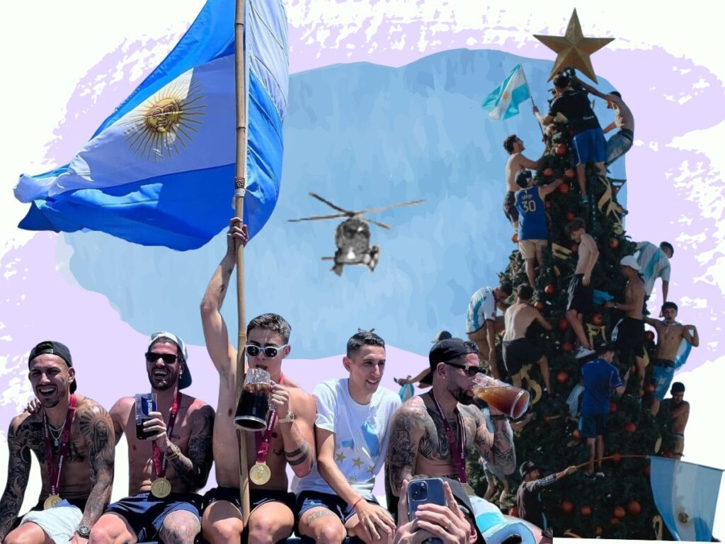 La pelota entró al arco y se hizo marea celeste. El testimonio de dos misioneros que se tomaron el primer vuelo que encontraron para recibir a la Selección en Ezeiza me conmueve hasta las lágrimas. Sacaron en cuotas el pasaje, no saben dónde van a dormir que van hacer solo vienen a alentar. Hacen fila en los semáforos para besarse o encontrar el amor. Dos parejas tucumanas se piden casamiento en la Plaza Independencia. Lo que es grotesco para algunos es romántico para otros. Imaginemos ese recuerdo: “Nos casamos cuando fuimos tricampeones”.