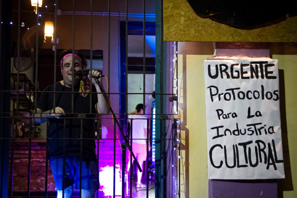 Inspirados en Susy Shock y con apoyo del bar cooperativo Pangea, los trabajadores del arte en Tucumán realizan todos los jueves la “Vereda Sanitaria Cultural”. Brindan espectáculos de diversas disciplinas a la vez que realizan un reclamo por protocolos para el sector de la cultura.